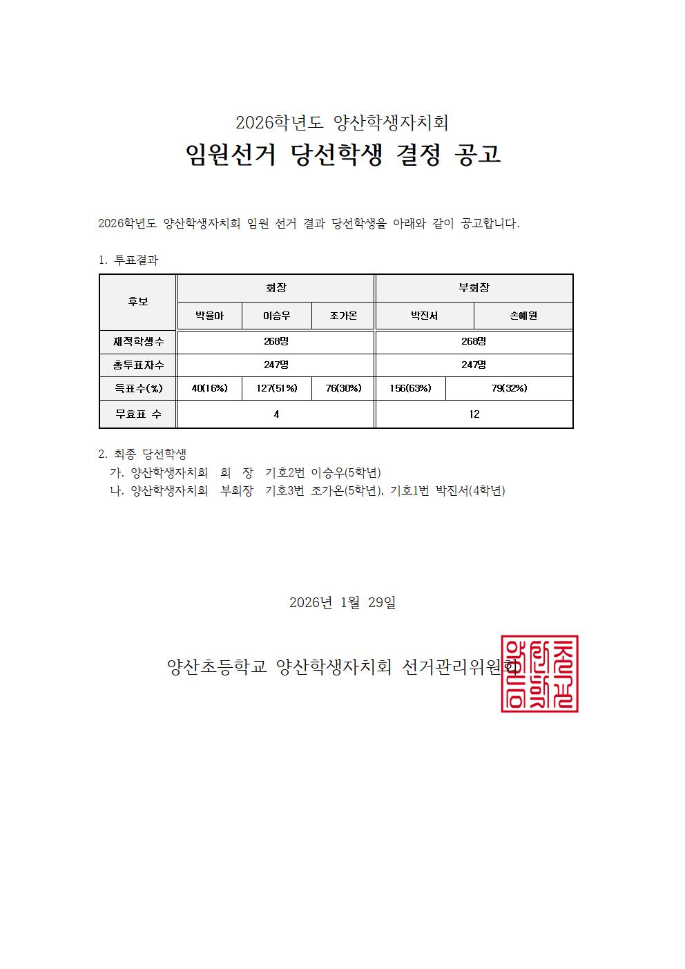 2026학년도 양산학생자치회 임원(회장,부회장) 선거 공고